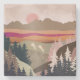 Uma paisagem abstrato com cores e texturas únicas mostrando uma paisagem natural com sol ascensão e dois gansos em tons de laranja, bege, marrom e rosa.