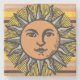 Sol grande sorridente e vintage, com uma ilustração tipo recorte de madeira no fundo das listras em laranja, amarelo, preto. Feliz, artístico ensolarado e design divertido. Excelente para casa de praia.
