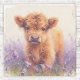 Uma porta copos de pedra com uma pintura aquosa de um filhote castanho adorável de Highland da Escócia num campo de flores silvestres roxas. Um pedaço de decor escocês de Vaca Highland que é perfeito para o quarto de um bebê decorado no estilo de um quintal.