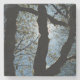 Uma silhueta de galhos de árvores ao sol da tarde, com novas folhas de Primavera.