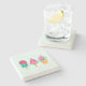 Uma porta copos de pedra com uma ilustração de 3 tratamentos de sorvete diferentes. Um picolé azul-esverdeado com gotas de morango e salpicadores coloridos. Um picolé de melancia. Um cone com camadas deliciosas de sorvete em rosa e menta. Todos com sorrisos kawaii fofos.