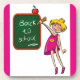 GAROTA ESCREVENDO "DE VOLTA À ESCOLA" NO QUADRO, COM UMA MAÇÃ PARA O PROFESSOR