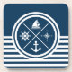 Design náutica com símbolos náuticos (âncora, barco à vela, roda à vela, bússola) decoração em fundo listrado branco e azul marinho.