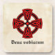 Uma cruz vermelha celta com a frase latina Deus vobiscum (Deus esteja com você) sobre um antigo pergaminho.