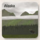 Uma pintura digital "primitiva" ou folclórica de coníferas verdes e montanhas no Alasca em um dia muito cinza e nublado. Um alce de touro (Alces Alces) no primeiro plano dá escala à cena. Leitura personalizável de texto, "Alaska" também é exibida.