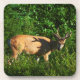 Uma fotografia de um galo jovem, com veludo, em alguns arbustos de folha verde. Copyright ©2017 Kimberly J Tilley.