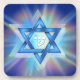 Estrela de David com a letra hebraica Shin no centro com raios coloridos de luz por trás.