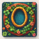 Fama oval de ferradura e ouro de trevo adornada com flores vibrantes e folhas verdes e peludas. O fundo é escuro, destacando a flora colorida e dando à composição uma sensação caprichosa e inspirada na natureza.