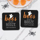 As portas copos modernas e bonitas da festa "Boos e Booze" do Halloween apresentam texto em laranja, cinzas de carvão e letras brancas com um pequeno sotaque fantasma.