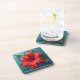 Uma flor de Hibiscus chinesa brilhante e corajosa, vermelha, com pétalas brilhantes, representada contra um pano de fundo liso de turquesa.