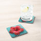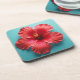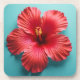 Uma flor de Hibiscus chinesa brilhante e corajosa, vermelha, com pétalas brilhantes, representada contra um pano de fundo liso de turquesa.