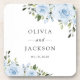 Adicione um toque pessoal à sua celebração de casamento com estes itens de na moda e festa memoráveis! Design apresenta flores azuis poeirentas de cor d'água e verde sobre fundo branco.