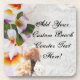 Bonito e leve coloração aquosa da praia a cor aquática do cenário de vida apresenta um close-up de um lei de flores de praia, com flores roxas, amarelas e laranja, folhas verdes, conchas e areia marrom e bronzeada, e espirais e decorações brancas. Um toque bonito para um favor de casamento na praia, férias ou manutenção viagem de um paraíso na ilha tropical ou apenas um acessório bonito. Todos os Designs Copyright © 2012 www.CustomInvitesOnline.com Este design está disponível como uma coleção completa!