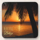 Lindos porta-copos impressos com um pôr do sol tropical em Belize atrás de uma silhueta de uma palmeira. Uma lembrança maravilhosa das suas férias na ilha