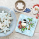 Galinha bonita cercada por flocos de neve sentados em um galho sagrado com Enfeites de natal.