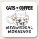 Gatos + Café = Manhãs mágicas. Os elementos essenciais para começar o dia. Esta imagem apresenta um design lúdico com um gato aninhado de dentro a copo de café. O texto acima diz "Cats + Café" e abaixo diz "As Manhãs Medíocres". O gato é desenhado num estilo simples, de desenho animado, com olhos fechados e uma expressão relaxada, como se desfrutasse de uma manhã acolhedora. A xícara de café é cheia de grãos de café, acrescentando ao tema de um início relaxante e agradável ao dia. As pegadas espalhadas ao redor do texto acrescentam um toque bonito e caprichoso, enfatizando ainda mais a conexão entre gatos e café. No geral, a imagem é uma representação alegre e encantadora da perfeita rotina matinal de um amante de gatos.