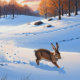 Nesta cena pitoresca, uma lebre majestosa se depara sobre um campo carregado de neve na luz solar suave do inverno. Esta imagem estilizada de aquarela encapsula a beleza indomada da natureza, convidando-os a abraçar a serenidade e a vitalidade da floresta de inverno.