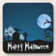 Feliz ilustração noturna do Dia das Bruxas com uma cena assustadora: fantasmas em um cemitério, corvo em um pedreiro e abóbora pendurados em uma árvore.