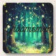 Uma linda noite de casamento, noivado ou aniversário com um caminho na floresta adornado com luzes de fada nas árvores, criando um cenário deslumbrante. Uma névoa suave paira ao fundo da floresta, com inúmeras árvores e luzes penduradas graciosamente em seus galhos.