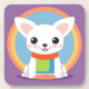 Ilustração de desenho animado adorável de um cão branco com uma expressão alegre, sentado num pano de fundo vibrante e colorido, calor radiante e brincadeira, perfeito para decoração ou temas infantis.
