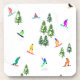 Arte legal de ilustração branca de snowboarders coloridos, descida de snowboard em montanhas entre pinheiros, spruce, árvores de abeto sobre pó fresco de neve. Snowboard e xmas esporte ao ar livre numa floresta de inverno. Dons do Snowboarder. Decoração de Natal de Snowboard.