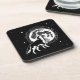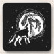 Linocut preto e branco de um rouco uivando na lua com um céu estrelado. A design original inclui uma paisagem escandinava com alpinistas de neve, árvores e alce.