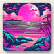 Trabalho de arte de neon vibrante representando uma praia tropical sob uma lua rosa massiva, com palmeiras, nuvens e um oceano calmo (Essa Design Feita Com IA). Faça a ordem hoje e encare a alegria de Comprar!