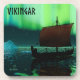Uma imagem ligeiramente estilizada de um navio de longa distância Viking navegando à noite sob as Luzes do Norte ali um casal de icebergs; a maioria da tripulação está dormindo. A leitura de texto "VIKINGAR" (Vikings) também é exibida.