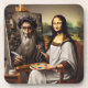 Uma reviravolta única e brincalhona na famosa pintura, mostrando Mona Lisa segurando uma paleta e uma escova, pintando ativamente o retrato da Vinci em um calcanhar.