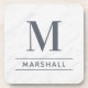 A design de porta copos de bebida personalizada clássica e moderna apresenta uma inicial de sorif personalizada masculina, mas elegante, juntamente com o sobrenome de sua família, acentuado com simples faixas horizontais contra um fundo de padrão de mármore branco. O texto da cinza azul de ardósia e as cores da design podem ser modificados para se coordenarem perfeitamente com a decoração da sua casa.