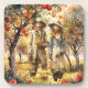 Dois espantões estão entre as macieiras de um pomar, cercados por maçãs maduras, tanto nos galhos como espalhadas no chão. Eles estão vestidos de roupas velhas e têm chapéus na cabeça, parados em um cenário pacífico e iluminado pelo sol. Digital Art Photoshop CS5