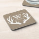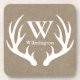 Os antlers brancos rústicos dos cervos mostram em silhueta a moldação de seus nome e letra de família no texto branco por todo o lado em um fundo do impressão de serapilheira do falso.
