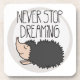 Cartão-postal bonito com ouriço desenhado com mão plana e citação inspiradora e motivacional Nunca pare de sonhar em um círculo azul claro sobre um fundo branco. | Bigstock® - Todos os direitos reservados.