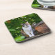 Um gato se senta no jardim verde, próximo a um tronco e olha à frente