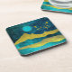 design de paisagem da montanha abstrato em tons de ouro, ciano e azul em tons negros, com um nascer, estrelas e pássaros.