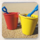 Dois grupos de pá e de baldes brilhantemente coloridos em um Sandy Beach.
