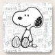 Este trabalho de arte de amendoim apresenta o Snoopy sentado sobre o fundo das tiras cômicas de Charles M. Schulz, preto e branco.