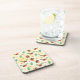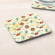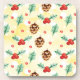 Porta copos com um padrão de Natal bonito, com pinos em cones e holly em um fundo de aquarela amarela com pequenos círculos brancos espalhados ao redor.