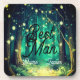 Um lindo casamento à noite, noivado ou aniversário com um caminho na floresta adornado com luzes de fadas nas árvores, criando um cenário deslumbrante. Uma névoa suave paira ao fundo da floresta, com inúmeras árvores e luzes penduradas graciosamente em seus galhos.
