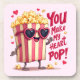 This playful design features a cheerful striped popcorn character wearing bold heart sunglasses, surrounded by sweet pops of color and a flurry of floating hearts. The bright pink lettering feels joyful and lively, giving the whole scene a flirty, whimsical charm perfect for lighthearted, modern romance themes. Its vibrant cartoon style and warm palette create a fun, upbeat mood that feels nostalgic yet fresh. AI generated artwork.
