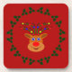 Imagem de uma rena de Natal, rodeada de Holly, sobre um fundo vermelho escuro.