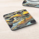 Um design de arte das rochas, impressões de pés, areia e piscinas rochosas na praia ao pôr do sol.