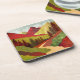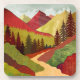 Uma paisagem de abstrato com texturas únicas mostrando uma paisagem de montanha com trilha caminhada e árvores e belos raios solares em tons de vermelho, creme, amarelo e verde.
