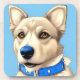 Retrato vívido de um cão branco com olhos expressivos, nariz azul, e vestindo um colar azul, colocado contra um pano de fundo azul macio, capturando elegância e caráter.