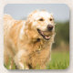 Retriever de ouro com esfera de Tênis em execução nos campos