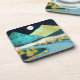 Uma bela paisagem com texturas únicas mostrando um rio e uma paisagem de montanha com lua ascensão e céu estrelado em tons de azul, ouro, verde escuro e amarelo.