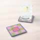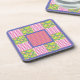 Um conjunto de Portas copos quadradas, com suporte de cortiça ou Matas Bebidas, com um padrão bonito de falso-patchwork de primatas cor-de-rosa profundo, azul violeta e amarelo sobre um fundo verde-folha, com gingham e bolinhas; de verificação cor-de-rosa e branca, da coleção "Primroses" Posh & Painterly.
