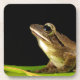 Fotografia de um sapo comum numa folha contra fundo preto.