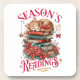 A festive and cheerful Christmas holiday design showcases an adorable kitten curled up on a large stack of books, accompanied by vibrant poinsettias. The scene is surrounded by hearts and stars, while the colorful text reads, "Season's readings." This delightful design is available on a variety of products, making it the perfect gift for book enthusiasts.