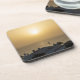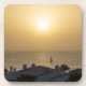 Vista através do complexo de bungalow até o mar com um barco à vela ao pôr do sol, em Costa Adeje, Espanha, Tenerife